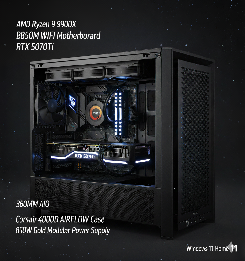 RTX 5070Ti Gaming PC: AMD Ryzen 9 9900X (12-Core), 32GB DDR5, 1TB NVMe SSD, Windows 11. Built for ultimate performance.